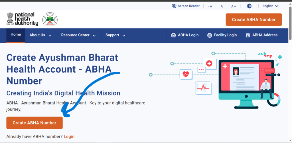 1• सबसे पहले आप लोगों को आयुष्मान भारत डिजिटल मिशन के आधिकारिक वेबसाइट “https://abha.abdm.gov.in/” पर जाना होगा